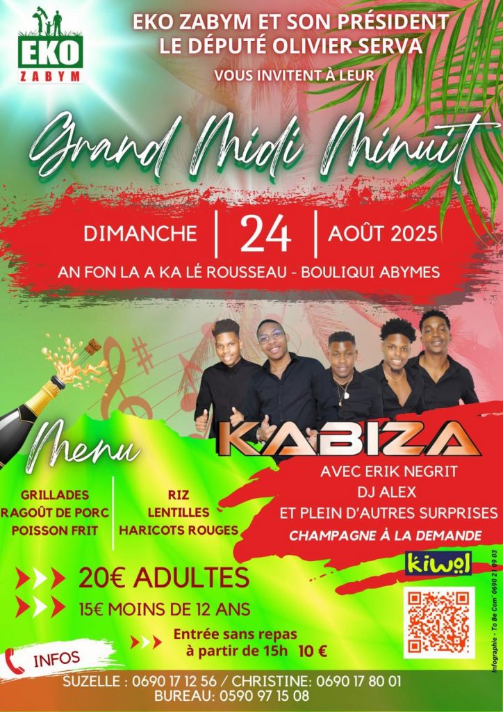 Le 24 août prochain, Olivier SERVA, député de Guadeloupe, invite à Bouliqui pour le grand « Midi-Minuit » d’EKO ZABYM, moment festif et musical autour des valeurs de solidarité et de partage qui animent son mouvement.