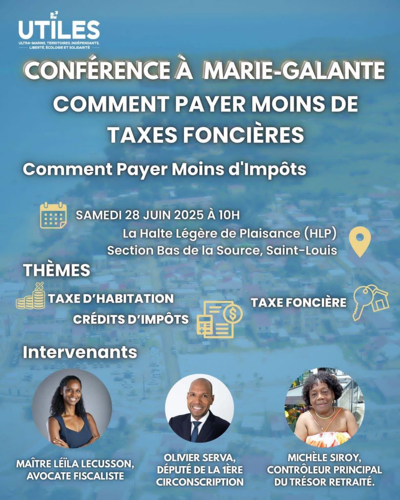 Le 28 juin, Olivier SERVA, député de Guadeloupe, a animé une conférence à Marie-Galante sur la fiscalité et la réduction de la taxe foncière et des impôts. Cet échange visait à offrir aux habitants des clés pratiques pour mieux comprendre leurs droits et obligations fiscales.