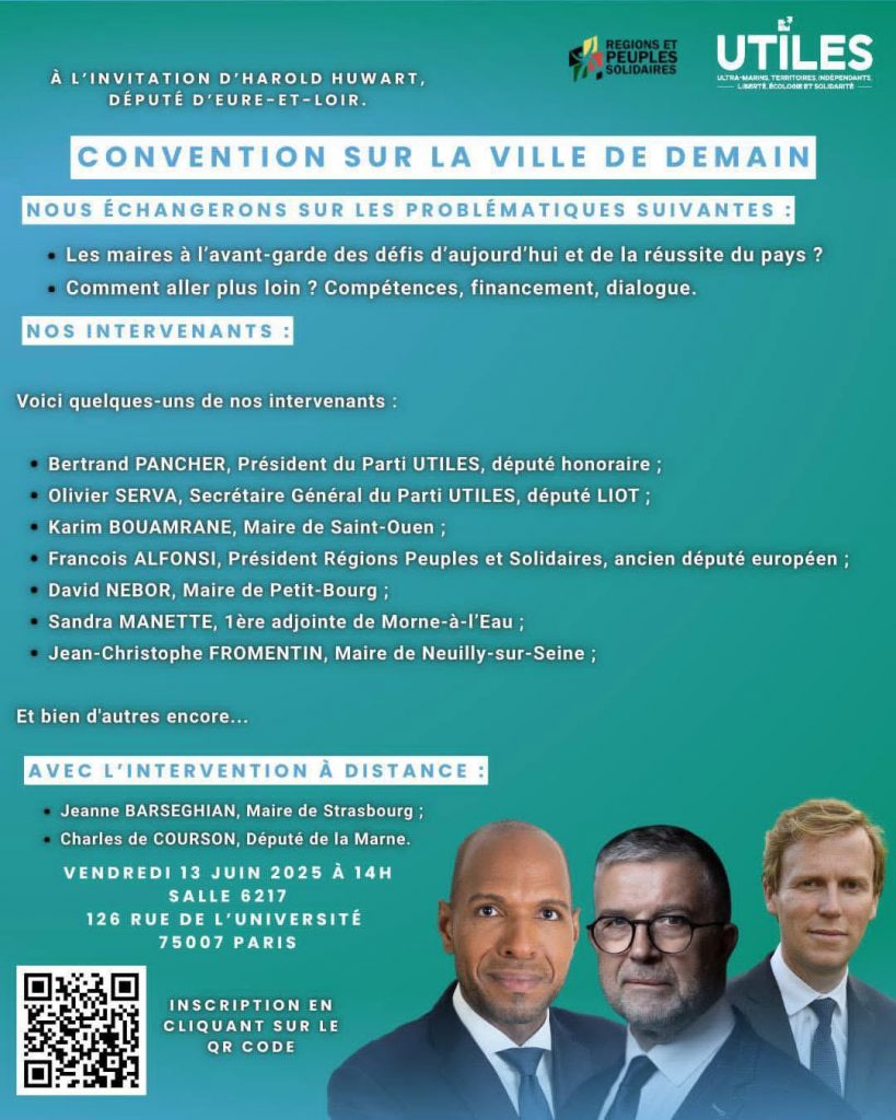 Le 13 juin, Olivier SERVA, député de Guadeloupe, a participé à la convention « La Ville de demain » organisée par le mouvement UTILES. En présence de Bertrand PANCHER, Jean-Louis BORLOO et plusieurs maires engagés, cette rencontre a permis de réfléchir aux défis urbains et à la contribution des Outre-mer dans la construction d’une France plurielle.